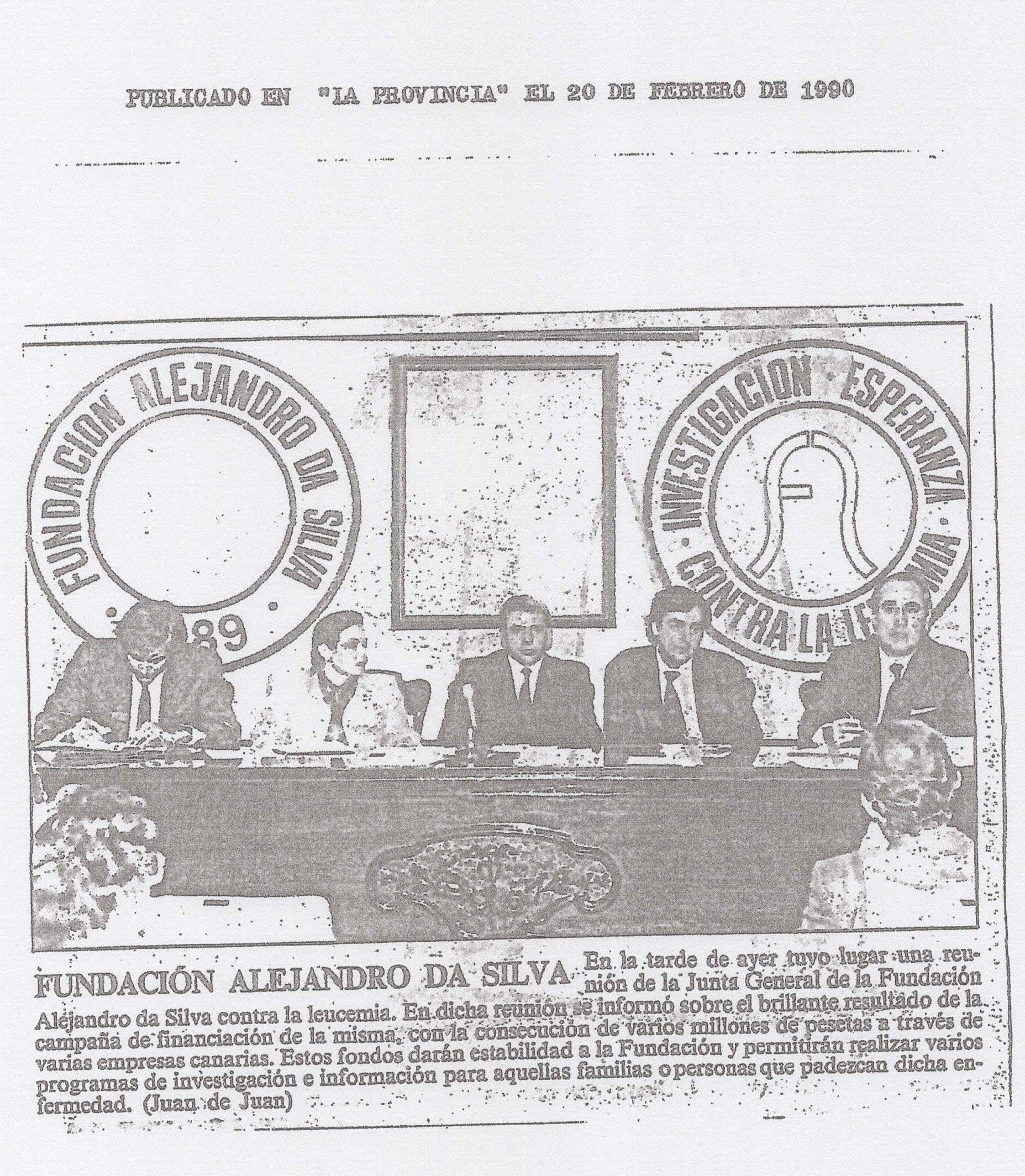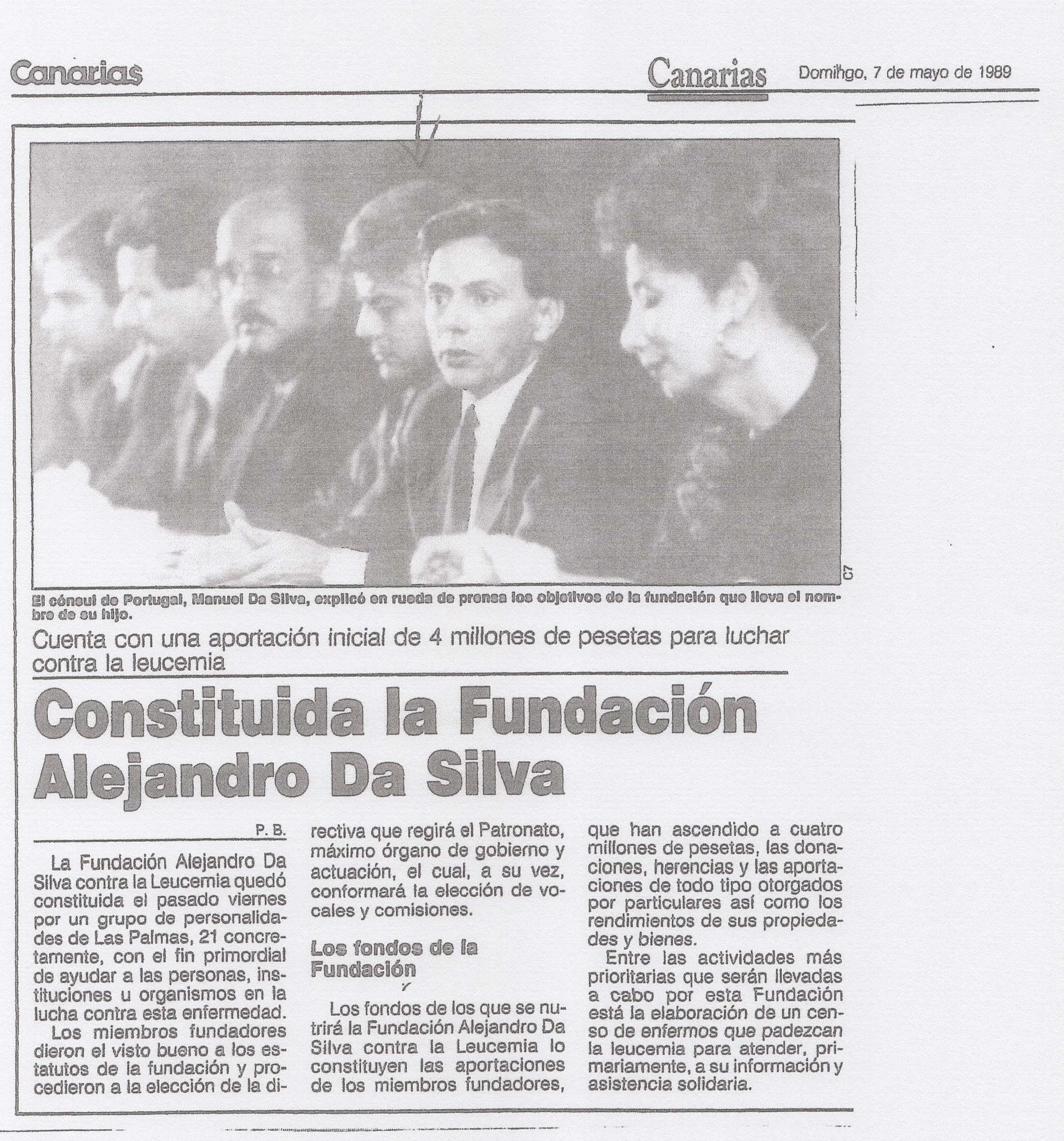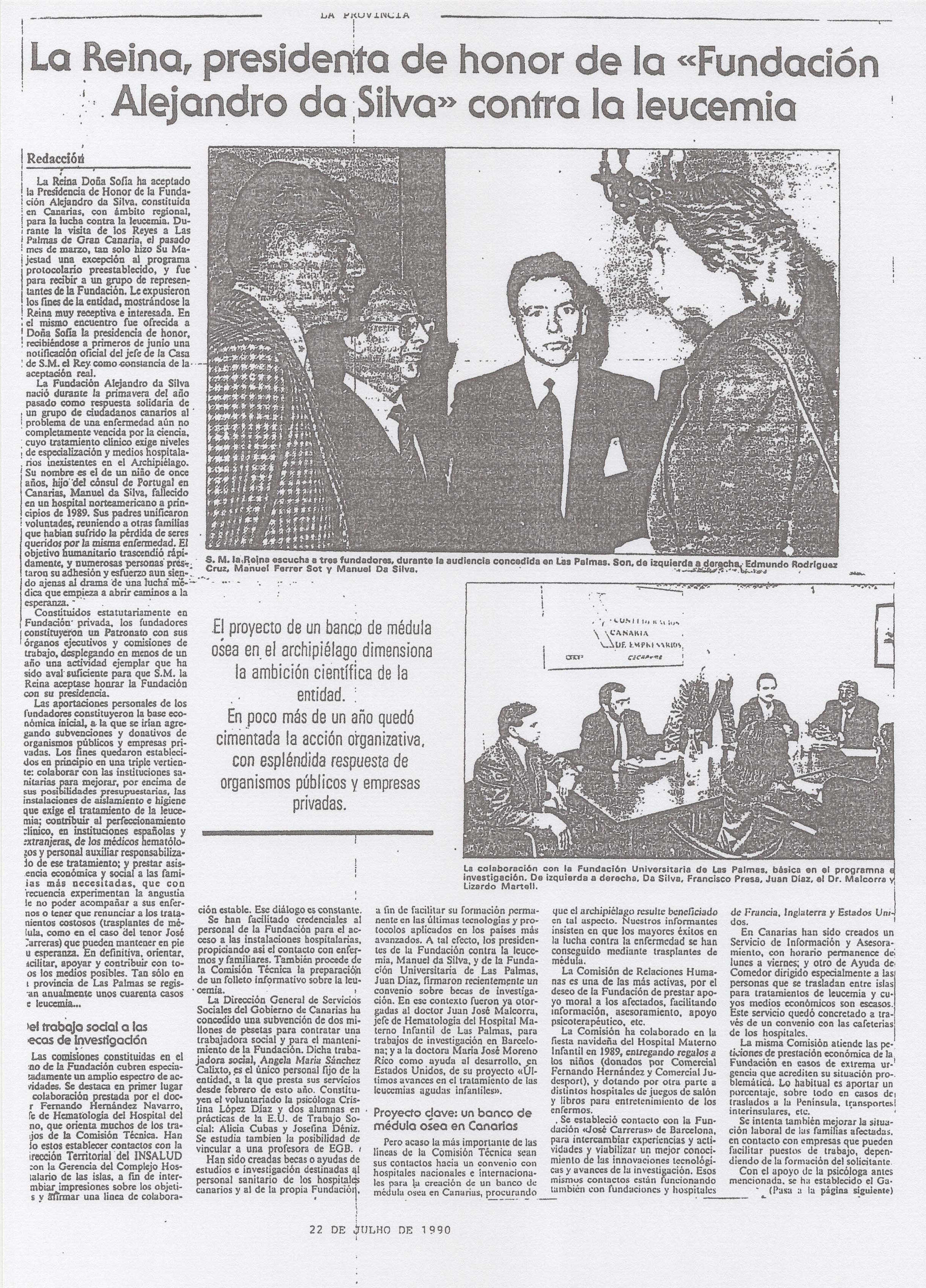 En 1990, Su Majestad la Reina Sofía aceptó la Presidencia de Honor de la Fundación Canaria Alejandro Da Silva contra la Leucemia.