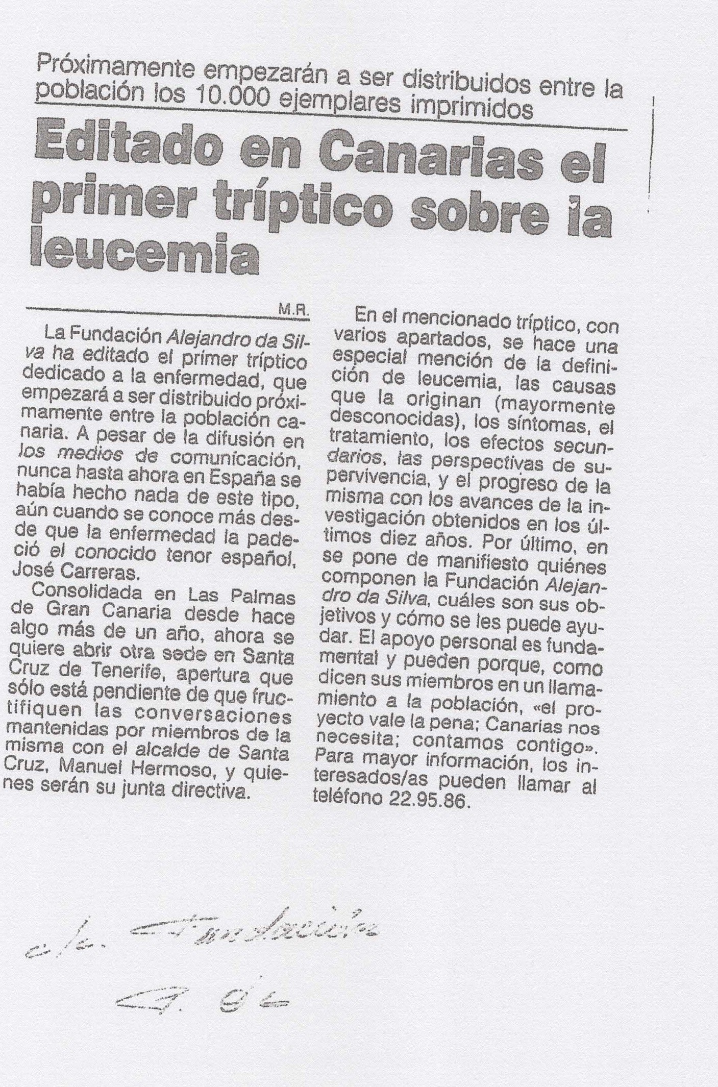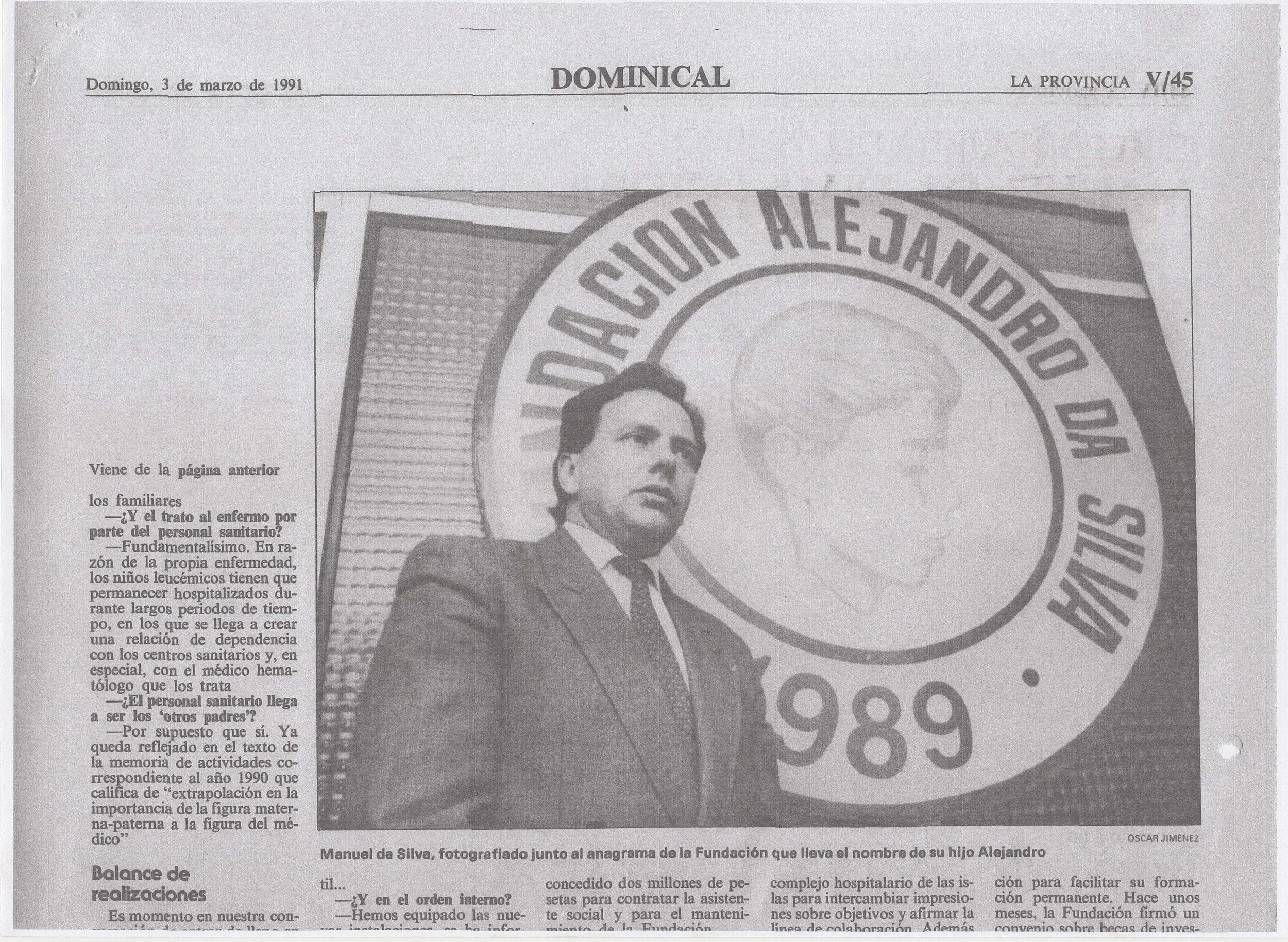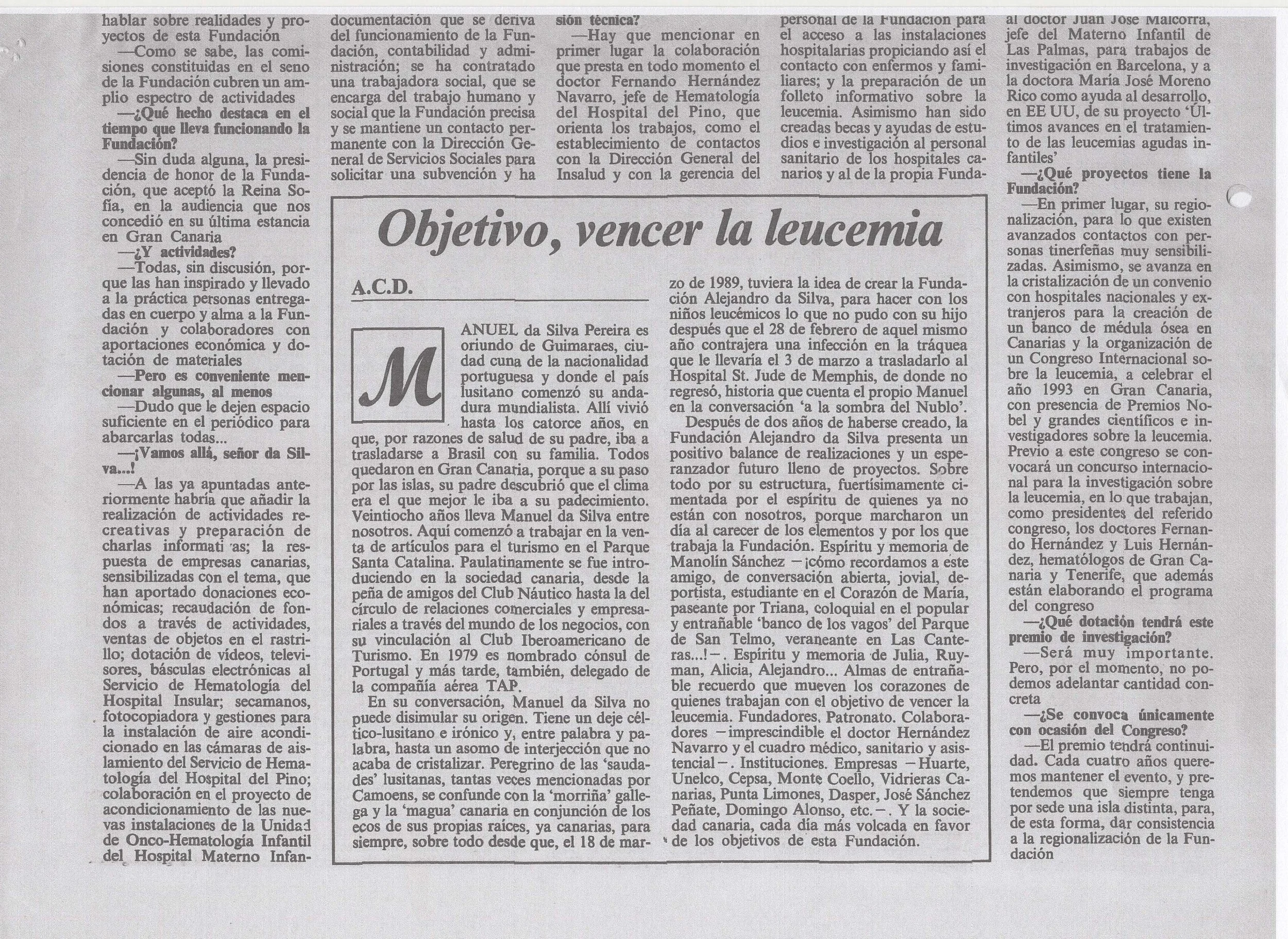 En 1990, Su Majestad la Reina Sofía aceptó la Presidencia de Honor de la Fundación Canaria Alejandro Da Silva contra la Leucemia.